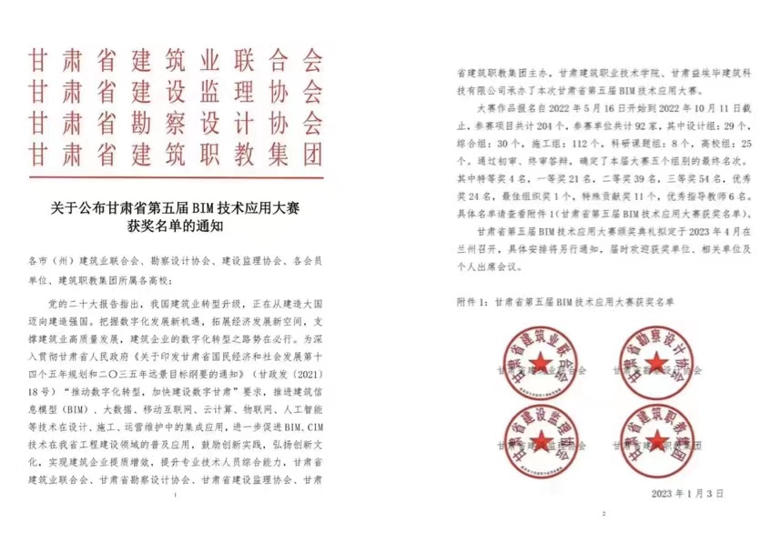 日前,甘肃省第五届BIM技术应用大赛结果宣布,甘肃AG亚娱集团集团共获得14个奖项,其中,“BIM技术在东乡县沿洮河经济带棚户区革新二期(调解)项目设计阶段的应用”等8个项目划分获设计组一、二、三等奖,“同心抗疫,智慧建造—甘肃省疾病预防控制中心公共卫生中心项目BIM综合应用”等3个项目划分获综合组特等奖及一、二等奖,“数字化转型配景下的勘察设计企业BIM技术推广路径探究”等2个项目划分获科研课题组二、三等奖,建筑设计院获特殊孝敬奖。