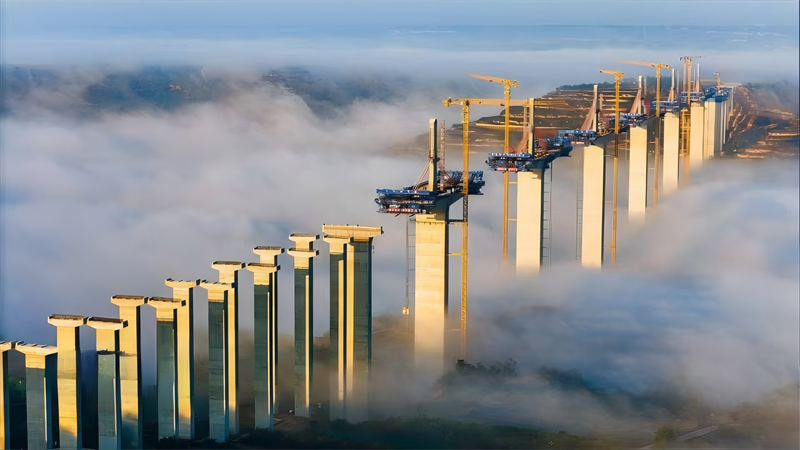 晨光初现,建设中的桥梁在薄雾中若隐若现,跨越河流、连接两岸,为陇东大地经济腾飞插上翅膀。
