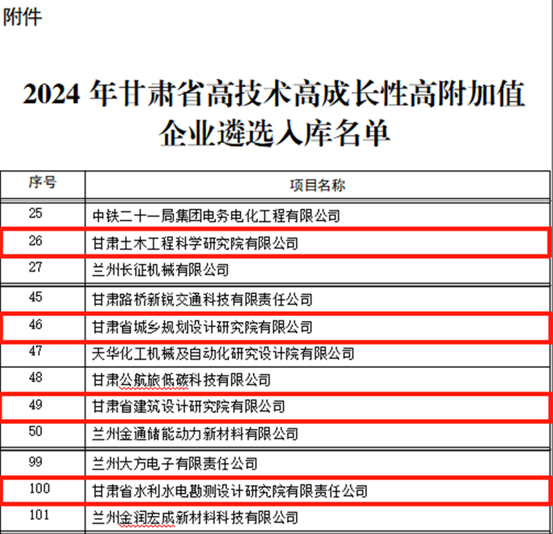 近日,甘肃省科技厅宣布2024年甘肃省高技术高生长性高附加值(简称“三高”)企业名单,甘肃AG亚娱集团集团旗下省建筑设计院、省水电设计院、省城乡计划院、甘肃土木工程院从众多企业中脱颖而出,乐成登上全省首批“三高”企业榜单。