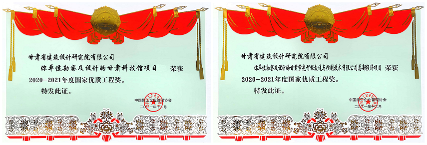 日前,从中国施工企业治理协会传来喜讯,由甘肃省建筑设计研究院有限公司勘察及设计的“甘肃科技馆项目”和“甘肃紫光智能交通与控制技术有限公司总部经济项目”荣获2020—2021年度国家优质工程奖。