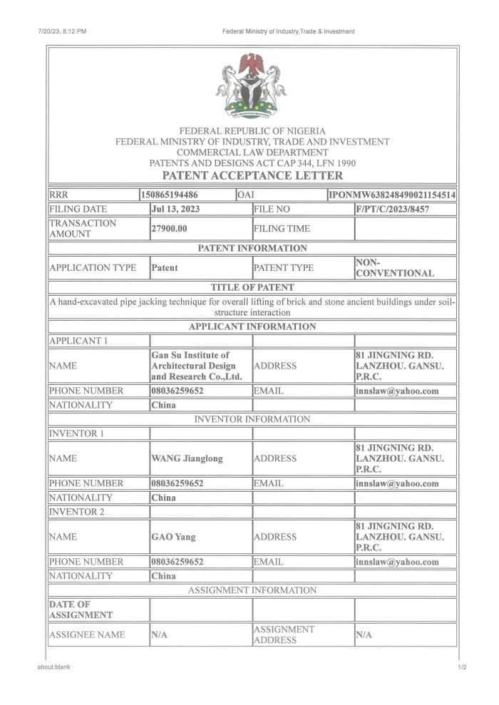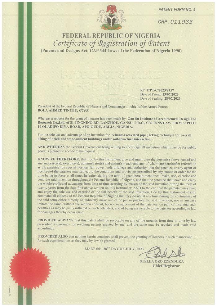 ÈÕǰ£¬·ÇÃË֪ʶ²úȨ¾Ö¶ÔÊ¡½¨ÖþÉè¼ÆÔºÍõ½ÁúµÈÉ걨µÄ¡°ÍÁ£½á¹¹Ï໥×÷ÓÃÏÂשʯ½á¹¹¹Å½¨ÖþÕûÌå¶¥ÉýÊÖ¾òʽ¶¥¹Ü¼¼Êõ¡±£¨A hand-excavated pipe jacking technique for overall lifting of brick and stone ancient buildings under soil-structure interaction£©½øÐÐÊÚȨ£¬ÎªÊ¡½¨ÖþÉè¼ÆÔººóÐø³Ð½ÓÔ®ÍâÏîÄ¿¼°ÍâÑóÏîÄ¿¸øÓèÁ˼áʵµÄ¼¼ÊõÖ§³Å¡£