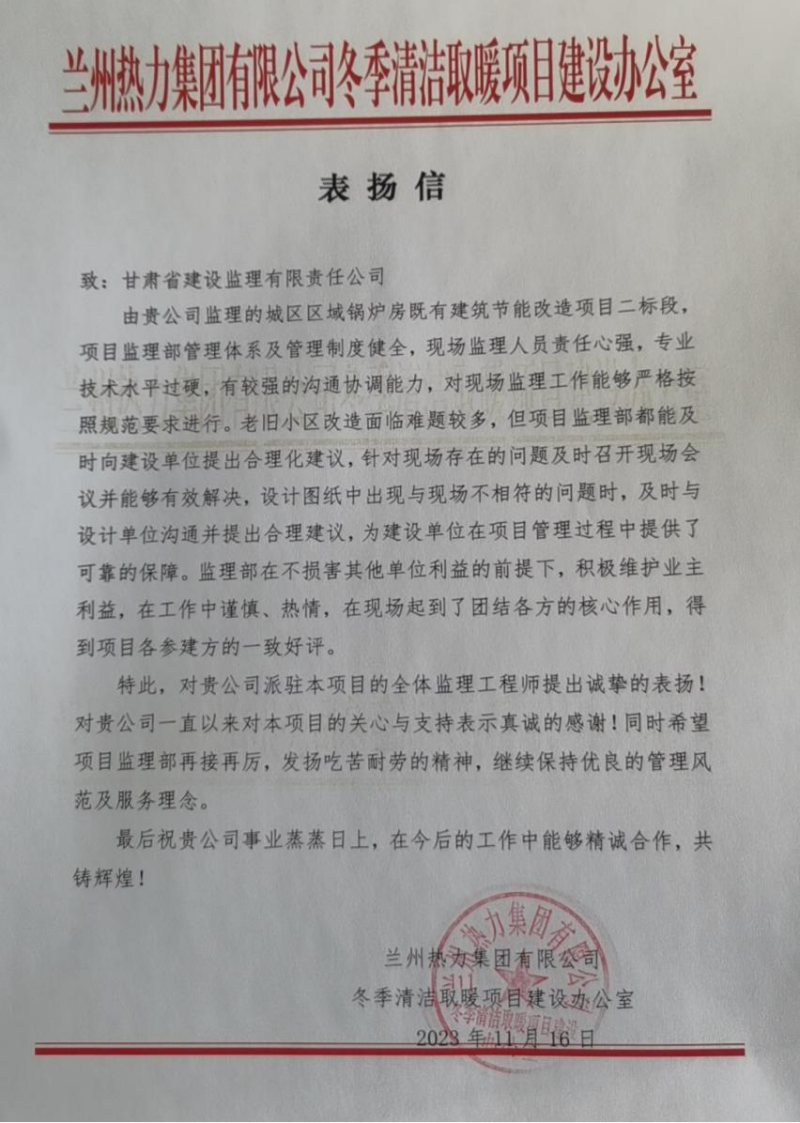 近日 ,省建设监理公司收到兰州热力集团有限公司冬季清洁取暖项目建设办公室发来的表扬信 ,对省建设监理公司城区区域锅炉房既有建筑节能革新项目二标段监理部全体人员体现谢谢。