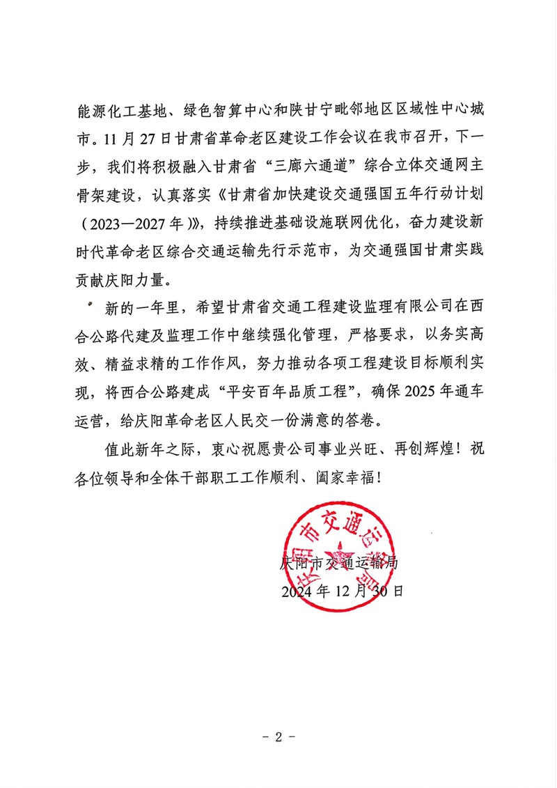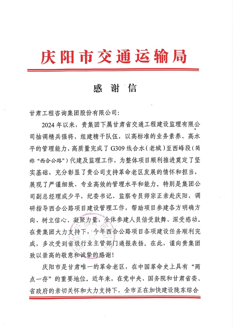 12月30日,甘肃AG亚娱集团集团收到庆阳市交通运输局的谢谢信,向省交通监理公司在G309线合水(老城)至西峰段公路项目建设历程中作出的孝敬体现谢谢。